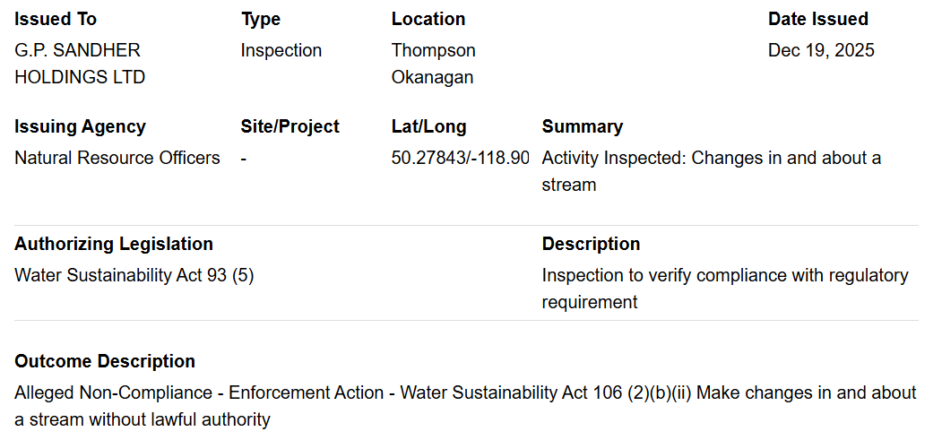 The Sandher Crime Family are being nailed for another illegal creek diversion in Lumby. A violation notice was issued December 19, the 2nd after one was issued in August. The Sandher Crime Family are stealing Crown water again, and give no fuk, again. Here.