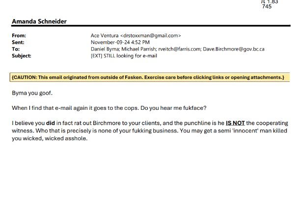 Cops uncovered a ‘credible threat’ against the life of Dave Birchmore and were required to warn him of that threat. Dave Birchmore’s premature demise would benefit Bir Singh Sandher and his Sinaloa Cartel. On September 25, 2024 dirty Fasken lawyer Daniel Byma was told by this blogger that Birchmore was a cooperating witness. That was a lie. He is not the informer. Daniel Byma ratted Dave Birchmore out to Bir Singh Sandher, putting his life in danger. The reason ALC boss Dave Birchmore provided an affidavit to support the Sandher lawsuit November 1, 2024 was because he feared for his life. Here
