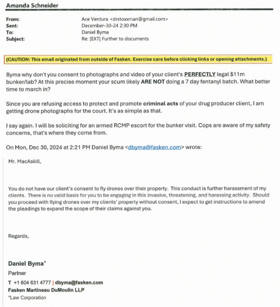This blogger had semi brilliant ideas to get at the truth of the Sandher drug lab buried on Black Mountain in Kelowna. Two ideas were floated to corrupt Fasken lawyer Daniel Byma. One was an in-person visit accompanied by armed cops. The second was considerably safer drone flights over the bunker. For obvious reasons Fasken (now Supreme Court of Canada knob) lawyer Daniel Byma was strongly opposed to any exposure of the Sandher drug lab on Black Mountain.