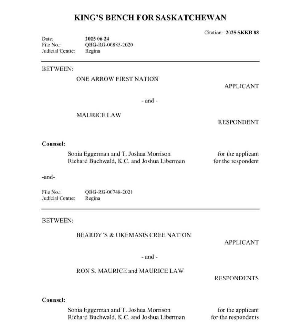 Beardy’s and Okemasis Cree Nation won a decision against Calgary-based Maurice Law in July 2025.  Legal fee agreements between them and its former law firm were unfair and, in some cases, unenforceable, a Saskatchewan judge ruled. Beardy’s had won a $4.5m judgment for withheld annuities, and in 2024, the nation reached a $4.1m settlement with Canada for unpaid salaries to chiefs and council. Maurice Law demanded more than $1.1m in fees plus a share of future contingency payments, even though it had already been paid. The agreements included what the court called “poison pill” clauses: if the clients switched lawyers before a settlement, they could owe up to half the expected contingency fee, plus other charges. The judge ordered Maurice Law to reimburse Beardy’s more than $826,000, as well as $100,000 in enhanced costs. Records showed one lawyer claimed 25 hours in a single day, and the nation was charged 338 hours just to draft a declaration of claim.