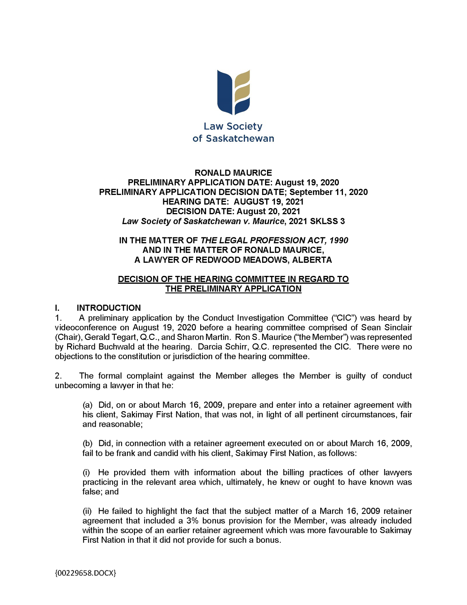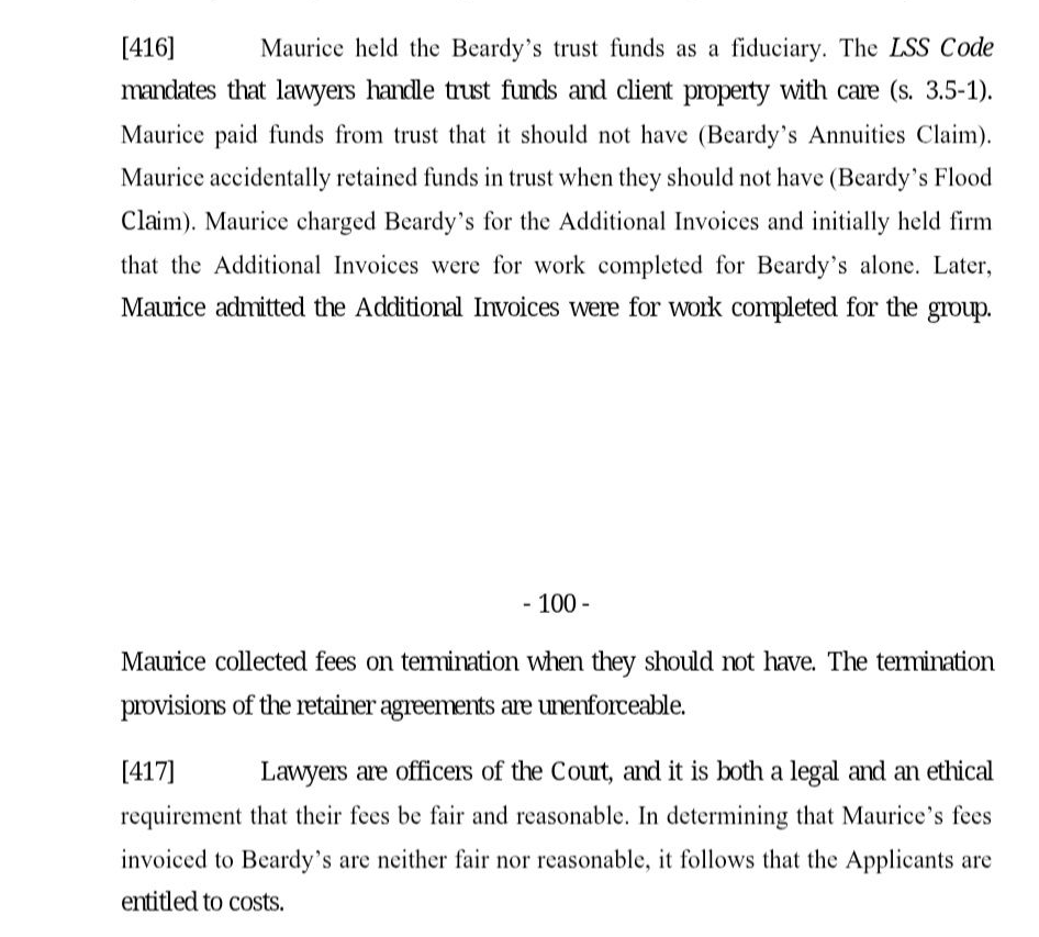 In 2016, the Saskatchewan Court of Appeal found that Maurice Law had already been hired on an hourly basis to represent Sakimay First Nation in land and flooding claims, but after a multi-million dollar settlement was nearly finalized, the firm pushed Sakimay to sign a new deal that would give Maurice Law a 3% bonus.