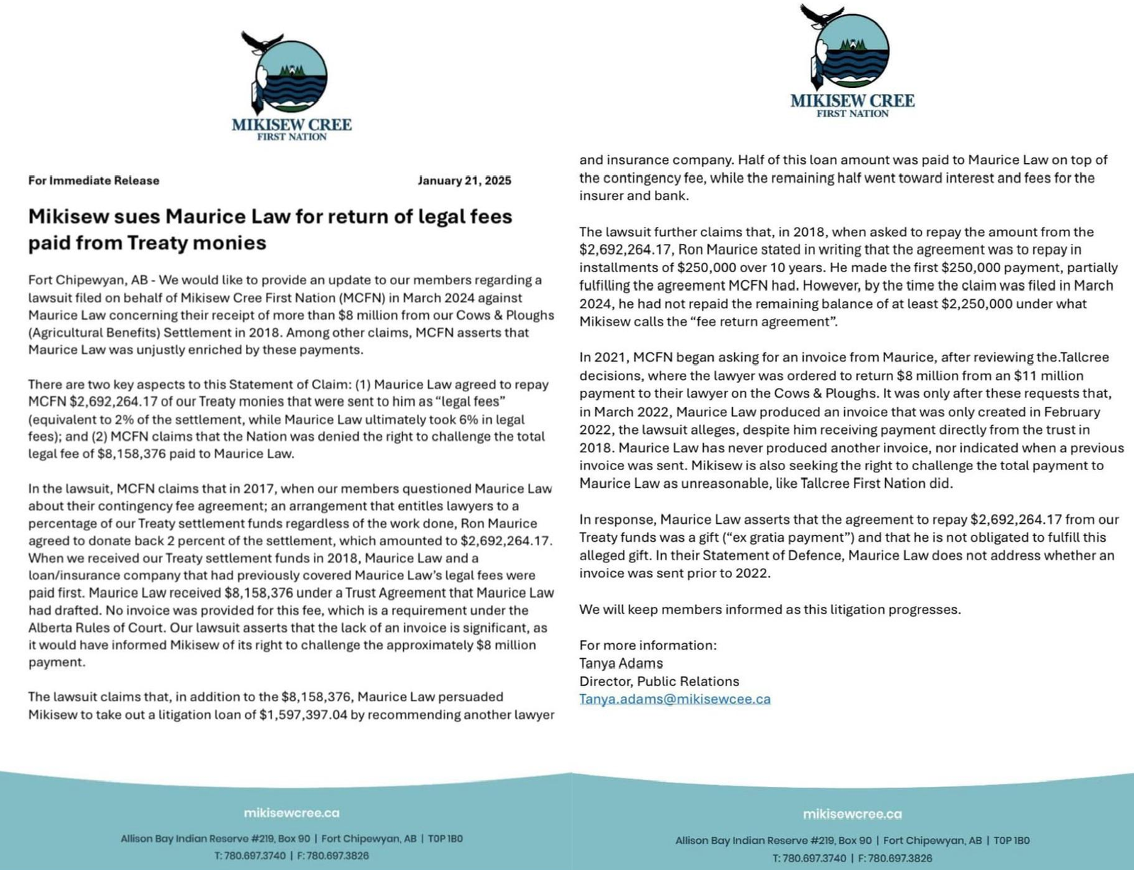 Mikisew Cree First Nation launched litigation against Maurice Law in March 2024 regarding their 2018 Cows & Ploughs (Agricultural Benefits) Settlement. Among other claims, MCFN asserted that Maurice Law was unjustly enriched. There were two aspects to the claim: 1. Maurice Law agreed to repay MCFN $2,692,264.17 of Treaty monies that were sent to him as “legal fees” (equivalent to 2% of the settlement, while Maurice Law took 6% in legal fees); and 2. MCFN claims that the Nation was denied the right to challenge the total legal fee of $8,158,376 paid to Maurice Law. (tanya.adams@mikisewcree.ca)