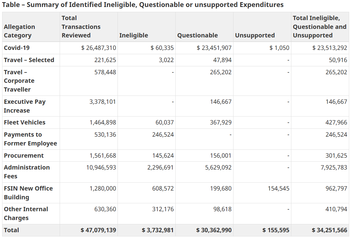 The Federation of Sovereign Indigenous Nations (FSIN) and chief Bobby Cameron (bobby.cameron@fsin.com) needs to explain expenses totalling $34,251,566 after an audit conducted by Indigenous Services Canada. Transactions reviewed show $3,732,982 as ineligible program expenditures, $30,362,990 as questionable and $155,595 as unsupported. FSIN received funding between April 1, 2020 and March 31, 2023. Questions related to $7,925,783 for administration fees and $962,796 for the FSIN’s new office building. Nearly $400k was burnt off in questionable fleet vehicle spending, and more than $260k in travel expenses.