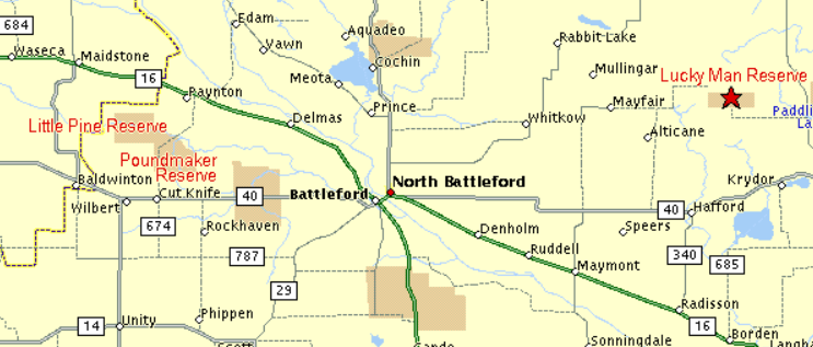 The Lucky Man Cree Nation was a part of Little Pine First Nation. The band was awarded the Lucky Man Reserve, an area of 7,680 acres, northwest of Saskatoon, in November 1989. Reported population in 2019 was 115, with 6 on reservation. Last numbers reported are 123 members with none on reserve. It belongs to the same Tribal Council as Poundmaker, Northwest Professional Services Corp.