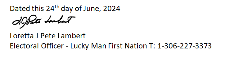 On July 5, 2024, the Lucky Man Cree Nation held an election for Chief and Council. Election officer, naturally, was Loretta Joy Pete Lambert.