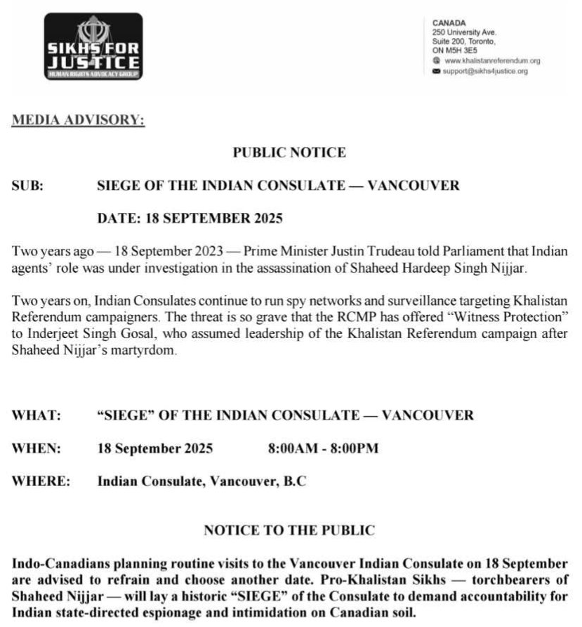 Sikhs for Justice (SFJ), a US-based Khalistani group, has threatened to “siege” the Indian Consulate in Vancouver.