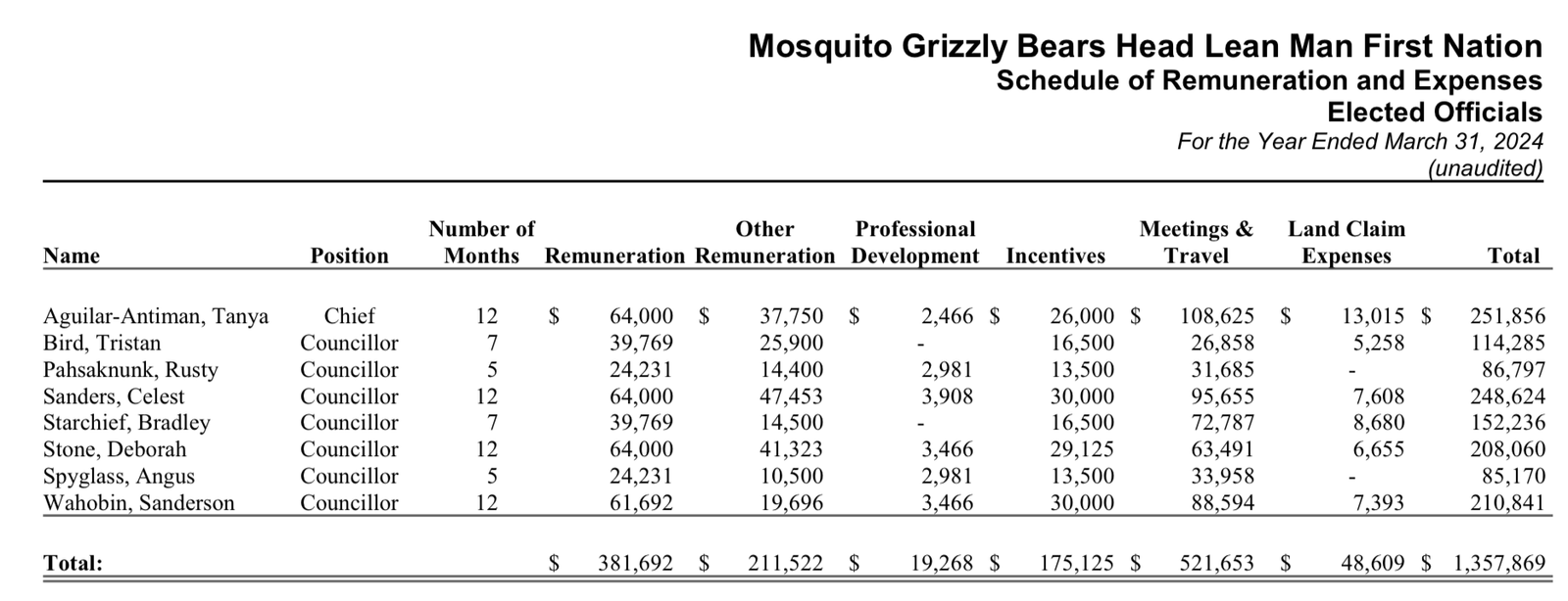 $250k per annum chief is Tanya Aguilar-Antiman. (tanya.stone@mosquitofn.ca) She is a BATC (Battlefords Agency Tribal Chiefs) Chief and known as Tanya Stone. She is best described as a self-obsessed narcissist, with a need for attention and admiration. She is said to be manipulative, bullying and creates a toxic work environment in the band office. She flaunts her extravagent personal life often on social media.