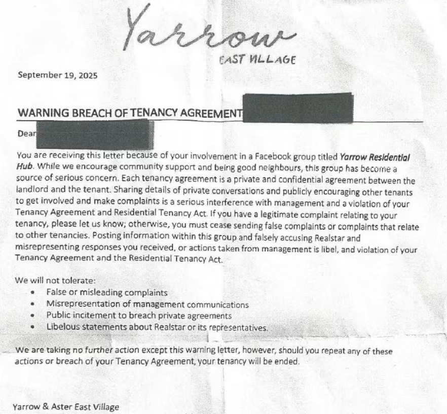 A group of Vancouver renters are fighting back after being threatened with eviction over their participation in a private tenants’ Facebook group. People living in ‘The Yarrow’ apartment building on Kootenay Street in East Vancouver say someone from Realstar Group taped a lying, threatening letter to their doors. The first line reads: “WARNING BREACH OF TENANCY AGREEMENT.”