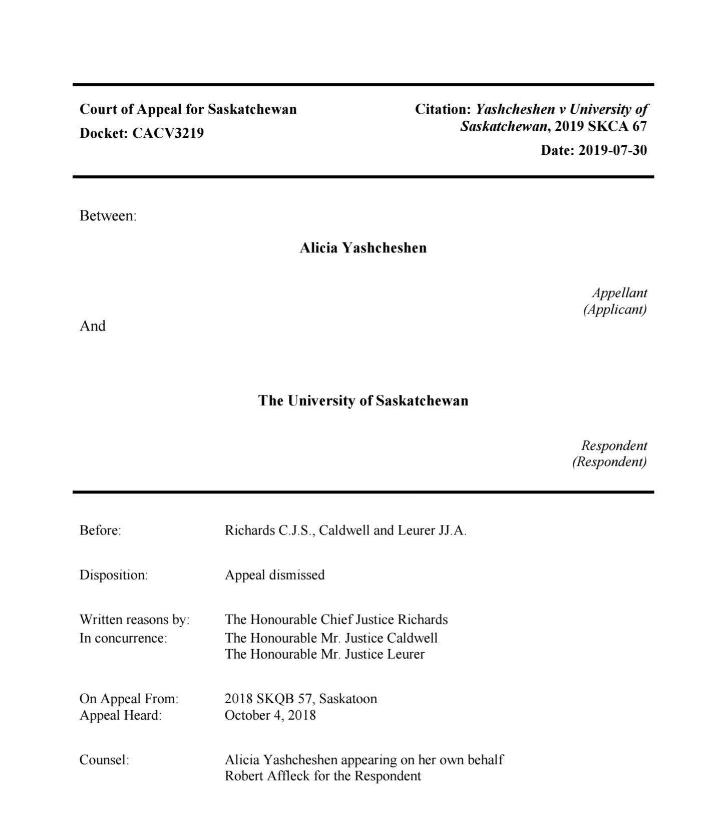 Alicia Yashcheshen applied for admission to the College of Law at the University of Saskatchewan in 2019, but sought an exemption from writing the standard law school admission test, the LSAT. She demanded a seat close to the ladies’ room and “stop the clock” testing. She also demanded to use pot during testing and breaks. Denied, she sued the law school for discrimination. The Court dismissed Yashcheshen’s application. She appealed, alleging a Charter breach, together with an allegation of bias on the part of the law school dean. That was dismissed in 2023 with the woman assessed $1,700 in costs. After plugging the system with multiple simultaneous applications, she was also declared a vexatious litigant.