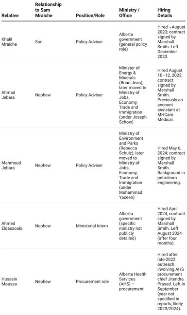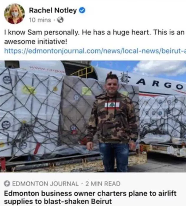 Former Alberta NDP premier Rachel Notley quietly deleted a post praising Mraiche in March 2025. “I know Sam personally. He has a huge heart. This is an Awesome initiative,” Notley said in 2020. At the time of her post Mraiche owned 4 companies, Carver PA Corporation and Krude Productions Inc., in the oil and gas industry, Mraiche Holding Corporation, and MYE Canada Inc., a bottled water company.