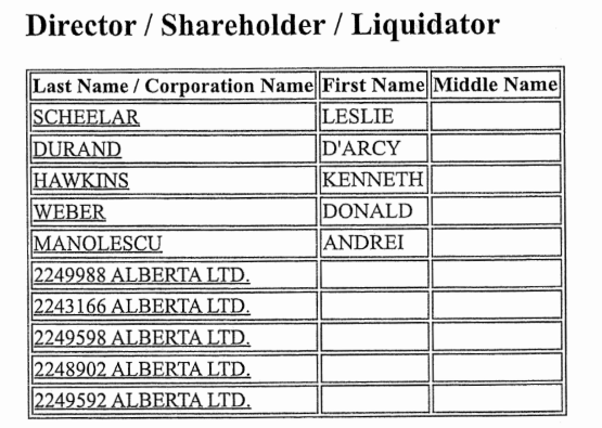 “The operating company for the CZ (Central Zone) was 2555327 Alberta Ltd. Its voting shareholders were numbered companies. The owner of each of these companies, and the percentage of voting shares they held were: