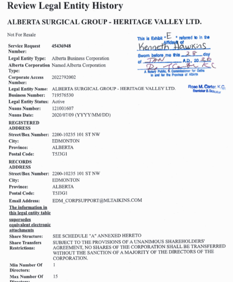 These three, on the numbered company registration documents all listed their address as #300, 14815-119th Avenue NW Edmonton. That is the address of the Carver building of MH Medical Care owned by Sam Mraiche. Two of the three newly registered numbered corporations formed a company called Alberta Surgical Group Ltd., which was created in February of 2020.