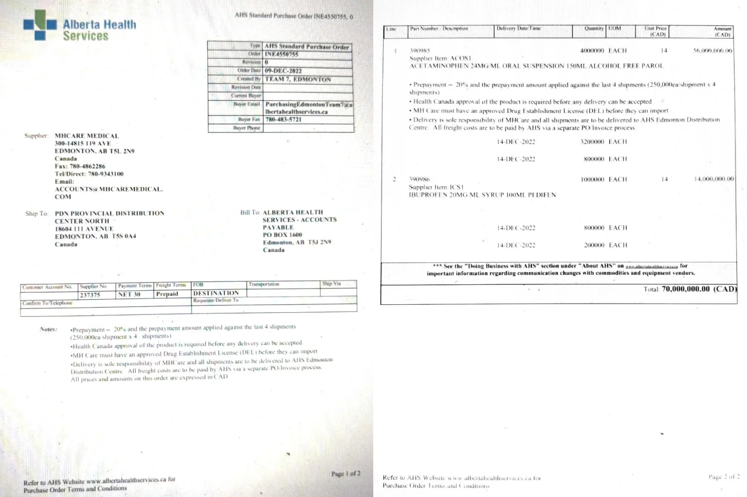 Middle man, for unknown reasons, was Hassan Khalil Sam Mraiche. 5 million bottles is about 10 to 14 times the entire national demand for children’s pain and fever medications. Alberta committed to purchase $70m worth of meds at $14 a bottle, more than twice the retail price. The other $10m evaporated in ‘internal costs’.