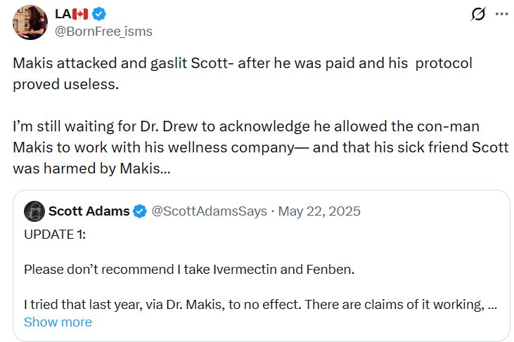 Cartoonist Scott Adams @ScottAdamsSays recently died after a battle with prostate cancer. The asshole William (Viliam) Makis slagged him for not following his high volume, high cost ‘protocol’. The fact was the dying Scott Adams took Makis vet deworming drugs for his cancer and not surprising they did absolutely nothing. William (Viliam) Makis is a career parasite conman and a PoS human being.