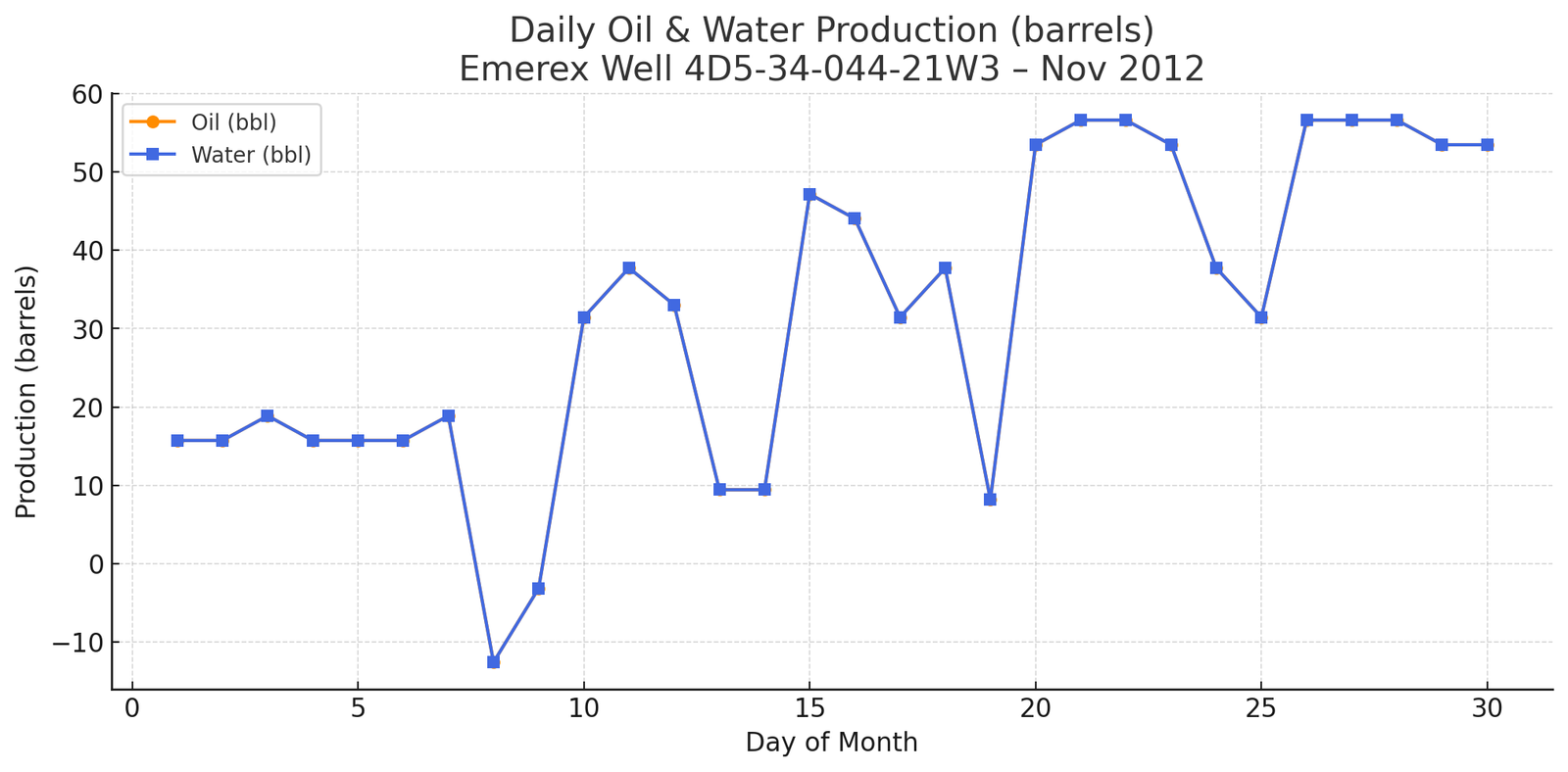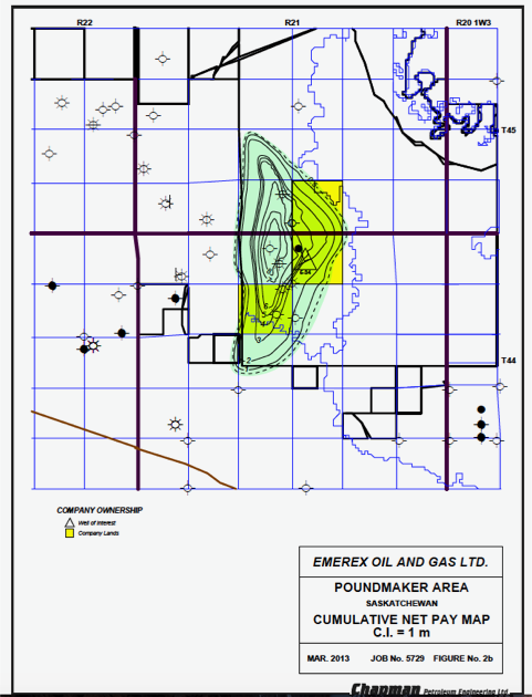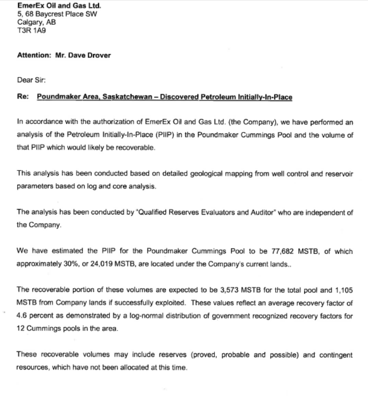 The Emerex discovery well at Poundmaker was production tested in November 2012. Independent engineering records (Amunrud Enterprises) reported 152.05 m³ → ~955 barrels of oil and about the same water.