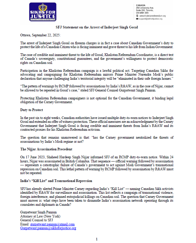 Indian reports that Inderjeet Singh Gosal (@Warrior9Singh) was busted with a weapon have been confirmed not by Canadian press, but by the terrorists of the SFJ (Sikhs for Justice) themselves.