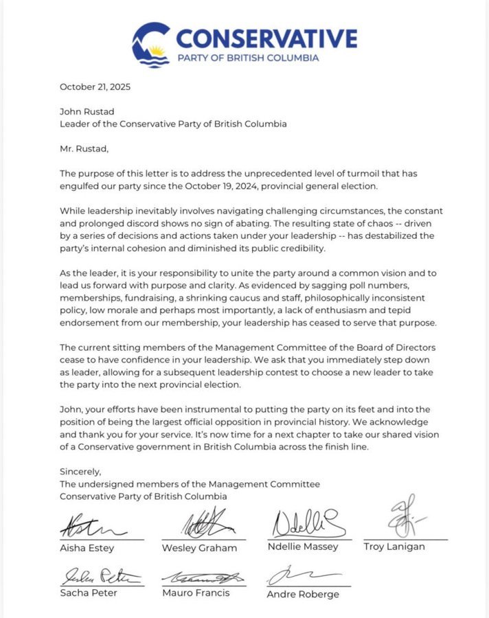 The ‘Management Committee’ of B.C. Conservatives want leader John Rustad to fuk off. The irony of course is they were all installed fraudulently in the first place. The only board member who did not sign the letter is Pavneet Singh.